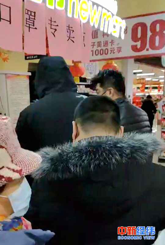 2月4日,物美超市内,消费者排队购买口罩。受访者供图